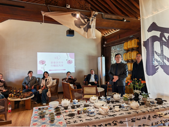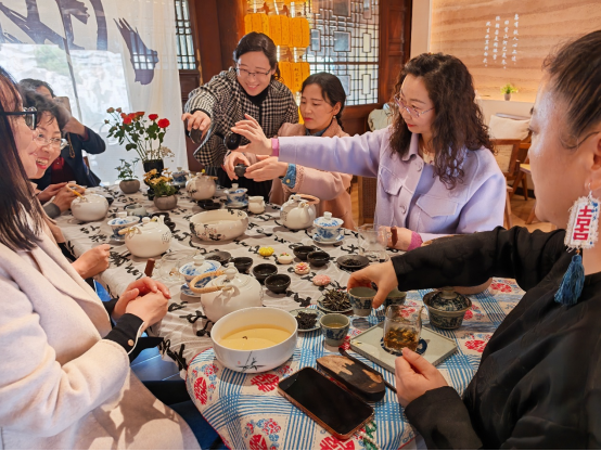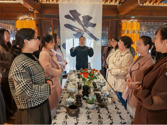 在悠扬古典乐声中,专业茶艺师带来行云流水的传统茶艺表演,温杯、投茶、注水、出汤,一招一式尽显东方雅致。茶艺师同步讲解茶文化历史、茶类知识与养生要义,带领大家沉浸式感受中华茶文化的深厚底蕴。随后的茶艺指导与实操体验环节,老师们在茶艺师手把手教学中,亲手尝试冲泡、品鉴不同茶品,在闻香、观色、品味间静心体悟茶道之美,现场茶香袅袅、笑语盈盈,尽显从容优雅。