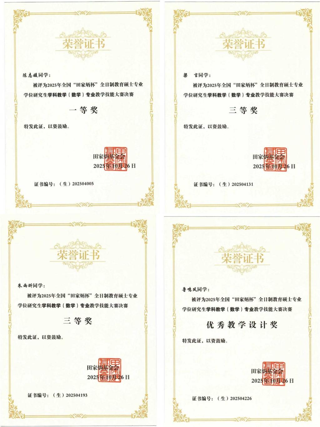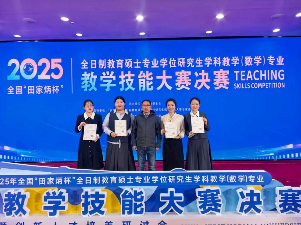 近日,2025年全国“田家炳杯”全日制教育硕士专业学位研究生学科教学(数学)专业教学技能大赛决赛在西华师范大学举行。经过激烈角逐,我校m88help center学科教学(数学)专业研究生陈志媛获一等奖,梁言、朱雨昕获三等奖,鲁鸣凤获优秀教学设计奖,m88help center教师彭燕伟博士获“优秀指导教师”奖。