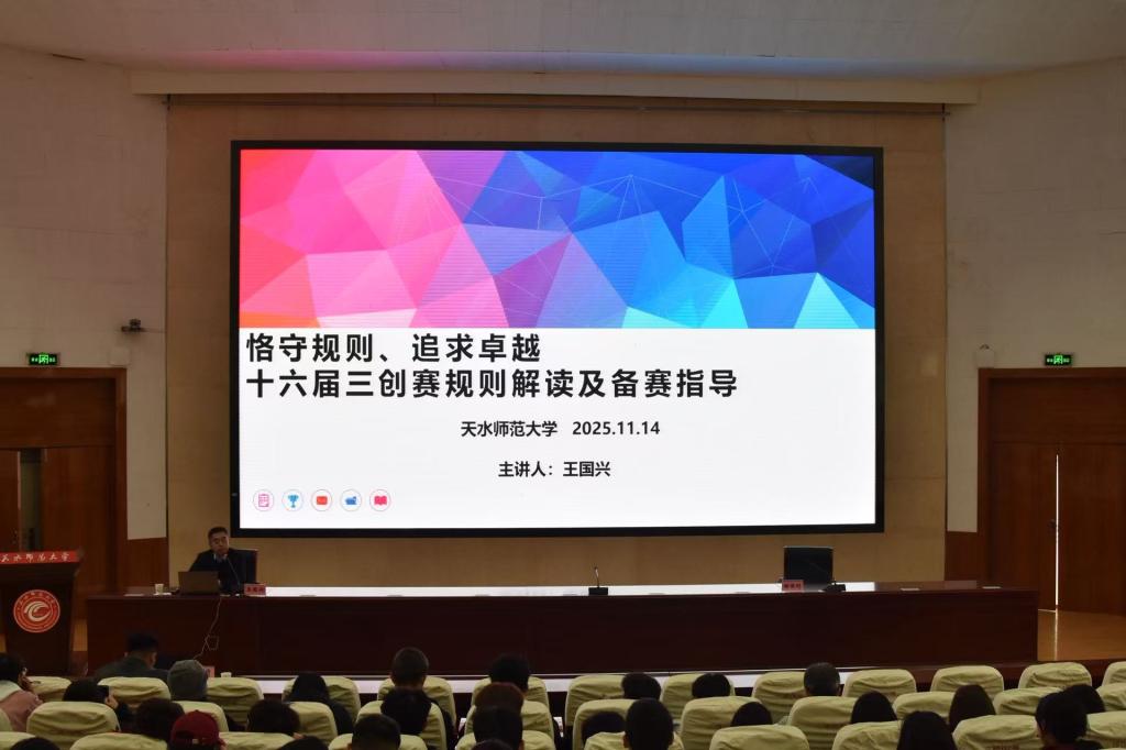报告会上,王国兴教授凭借其深厚的学术造诣和丰富的竞赛指导经验,从竞赛核心信息、团队搭建、作品准备到答辩技巧等方面带领同学们全面了解“挑战杯”大学生创业计划竞赛——这项被誉为中国大学生科技创新创业“奥林匹克”盛会的赛事。并从赛事类型、比赛时间安排、核心竞赛规则、实战赛备赛核心、组队要点及项目材料规范行等方面做了第十六届“三创”赛规则解读及备赛指导。